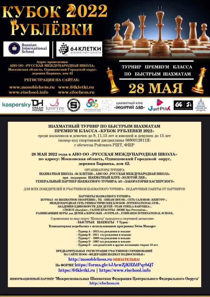 НЫЕ ШАХМАТИСТЫ ПРИГЛАШАЮТСЯ на ШАХМАТНЫЙ ТУРНИР по БЫСТРЫМ ШАХМАТАМ ПРЕМИУМКЛАССА «КУБОК РУБЛЕВКИ 2022» среди мальчиков и девочек до 9, 11,13 лет и юношей и девушек до 15 лет (номер-код спортивной дисциплины 0880012811Я) с обсчетом Рейтинга РШТ , ФШР 28 МАЯ 2022 года в АНО ОО «РУССКАЯ МЕЖДУНАРОДНАЯ ШКОЛА по адресу : Московская область, Одинцовский Городской округ , деревня Барвиха, дом 42.